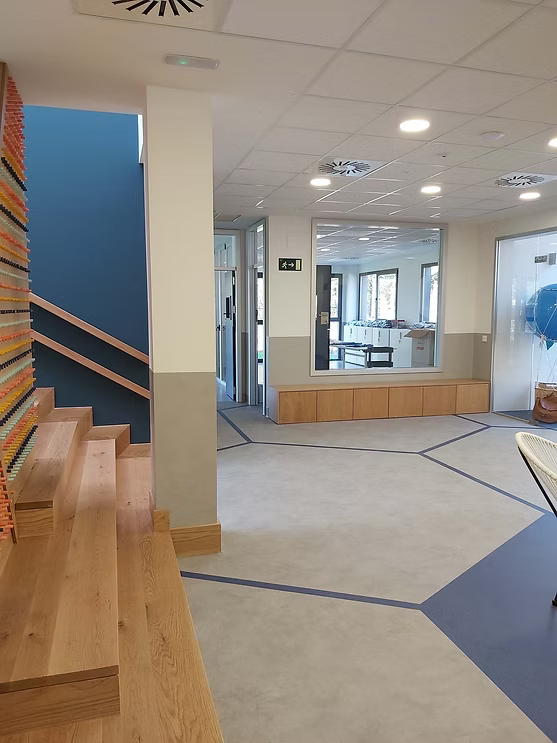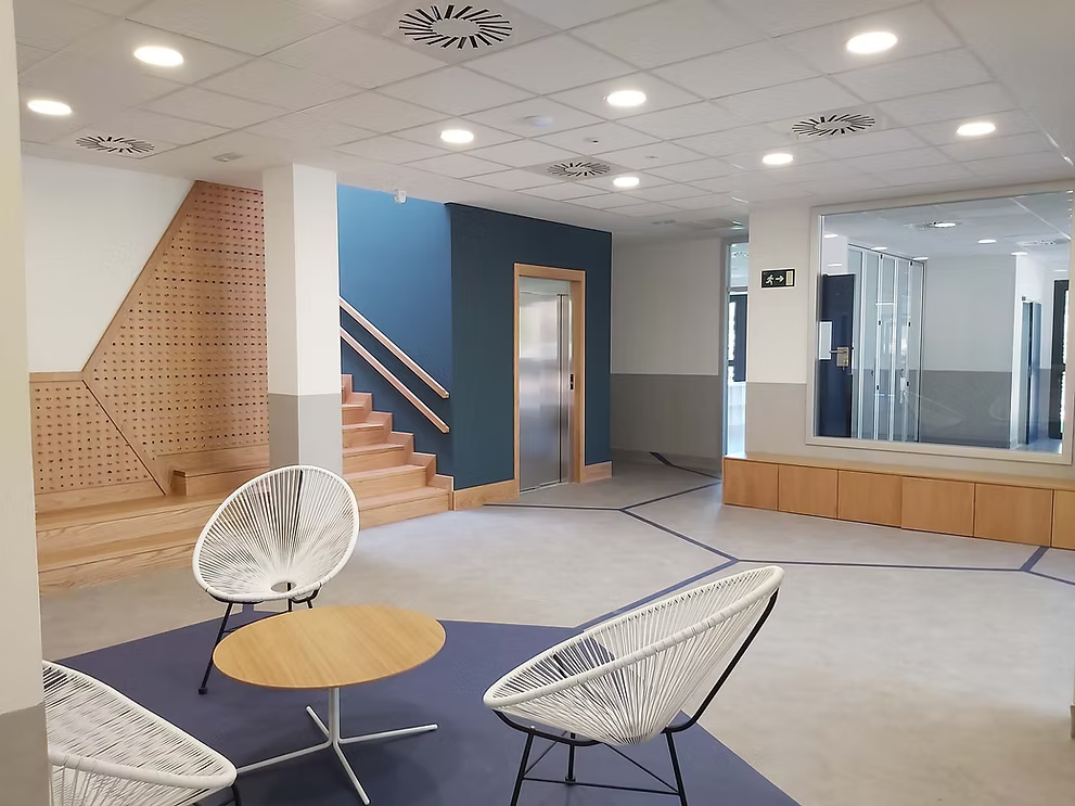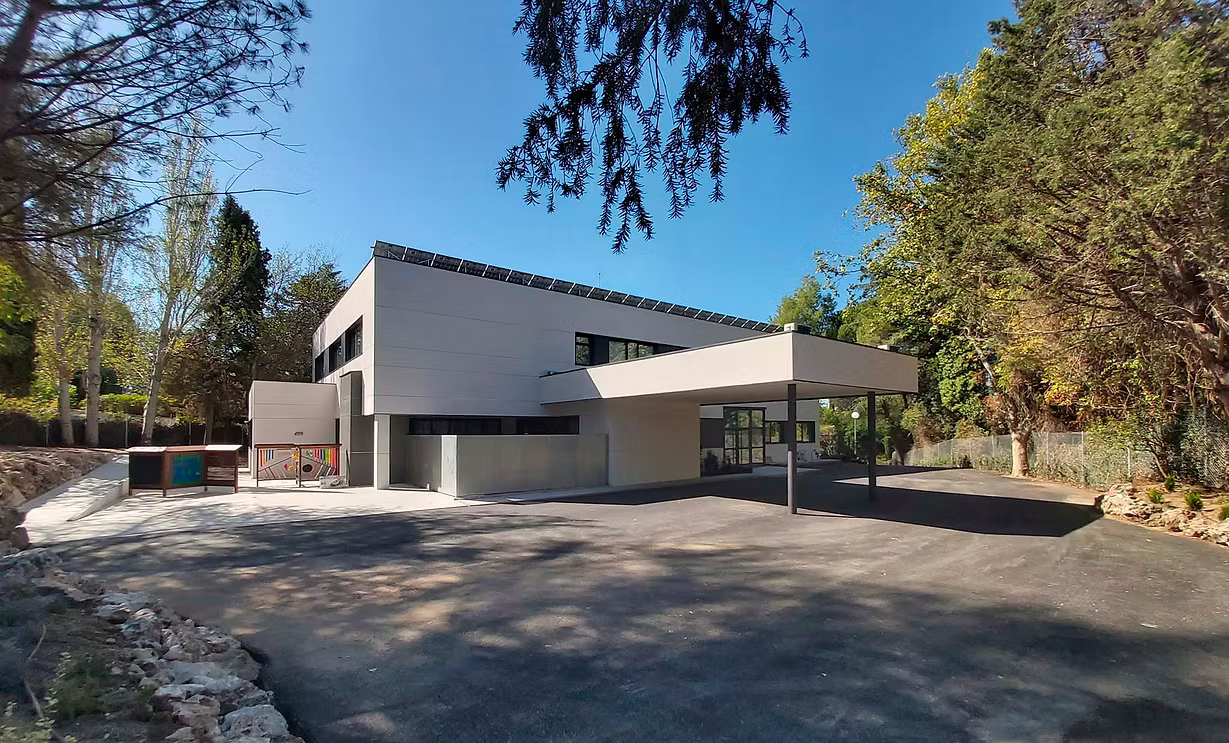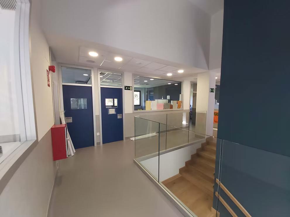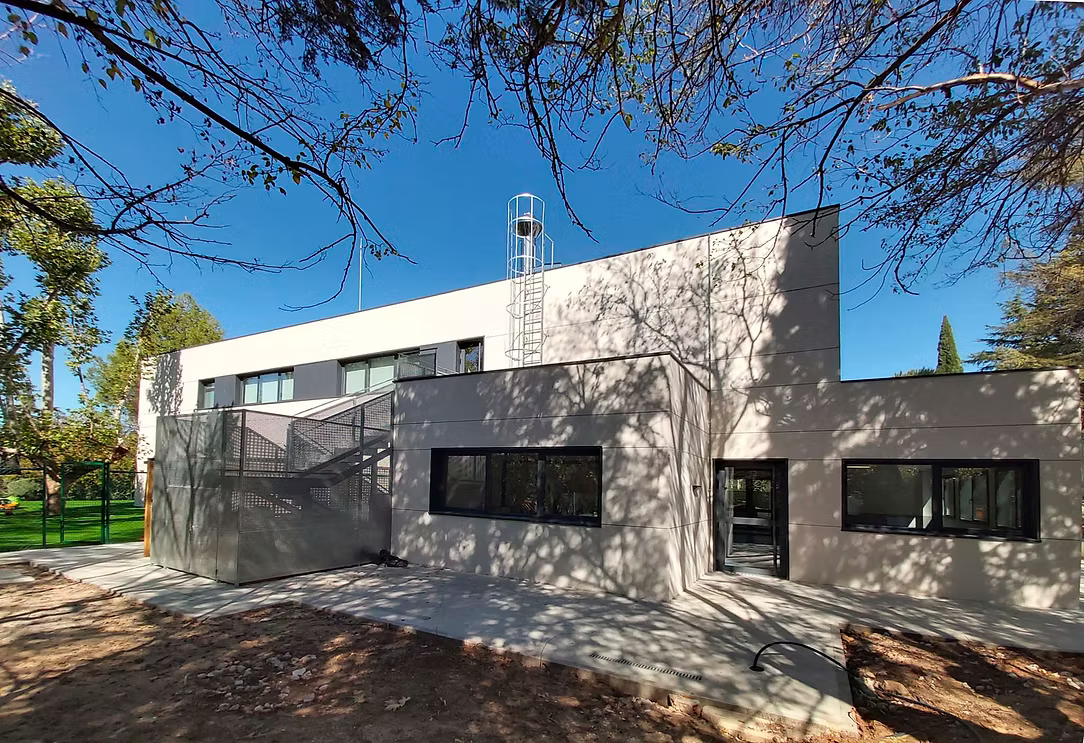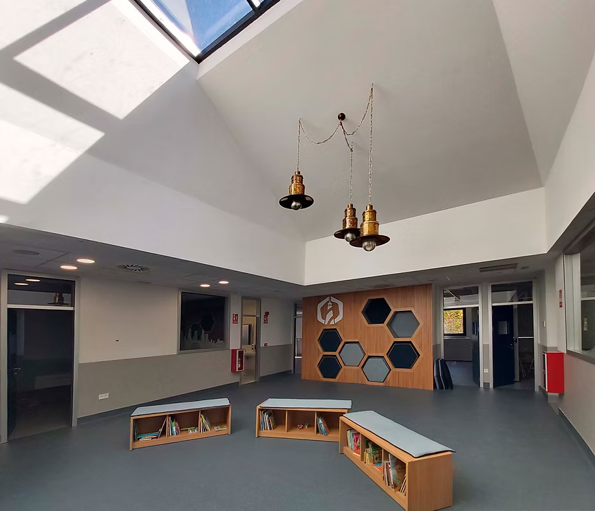 Este colegio de tres plantas organiza sus espacios en torno a un gran lucernario central que baña de luz las zonas comunes. En el interior dominan materiales neutros, madera y detalles en azul. El volumen blanco exterior, con carpinterías en negro, refuerza la claridad y orden del conjunto.