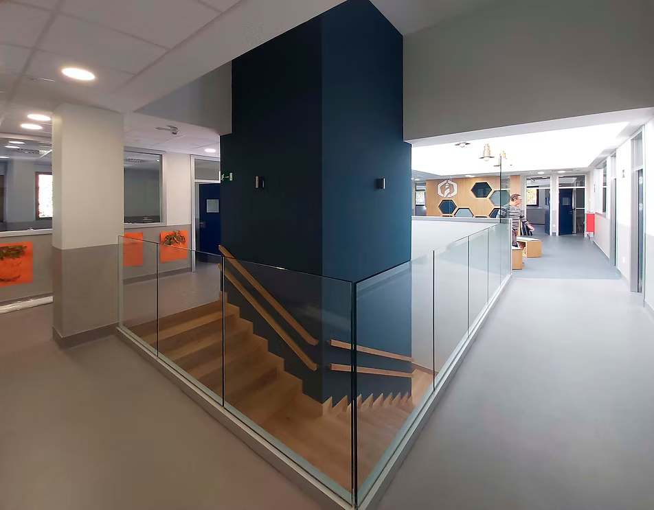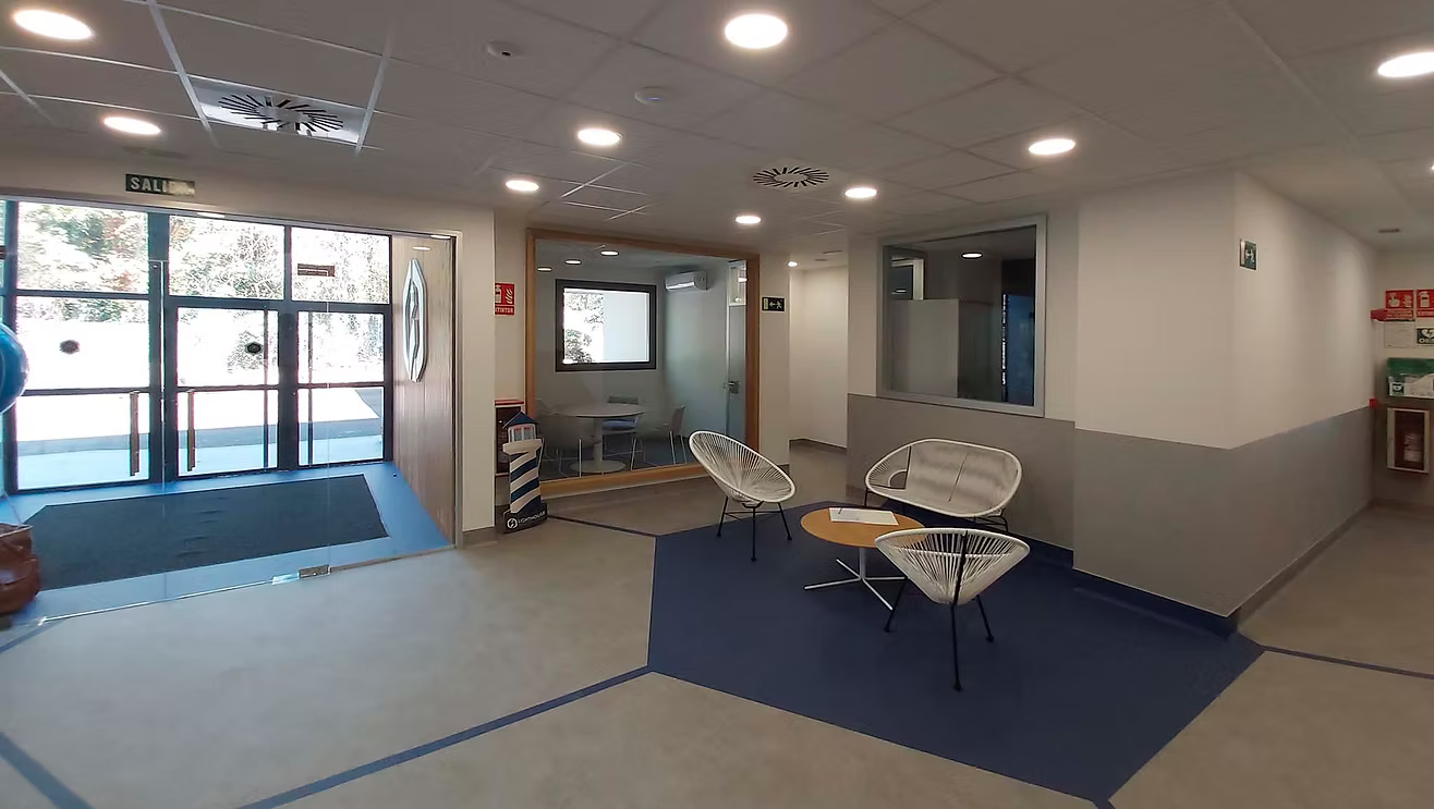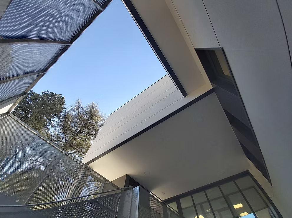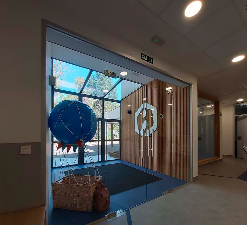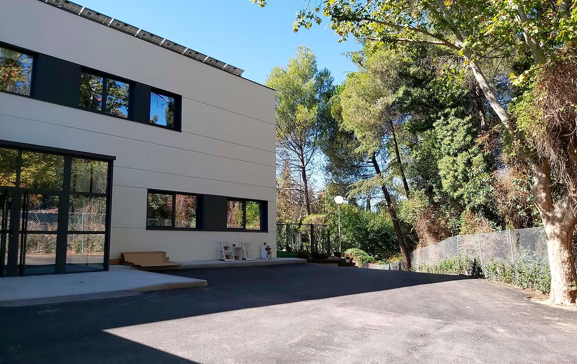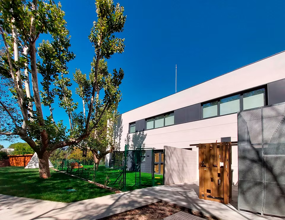 Este colegio de tres plantas organiza sus espacios en torno a un gran lucernario central que baña de luz las zonas comunes. En el interior dominan materiales neutros, madera y detalles en azul. El volumen blanco exterior, con carpinterías en negro, refuerza la claridad y orden del conjunto.