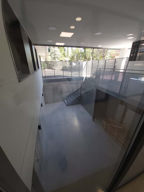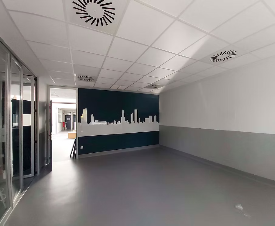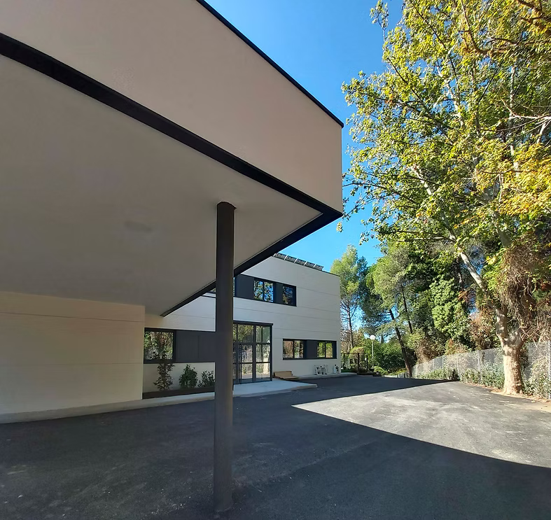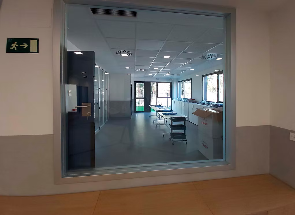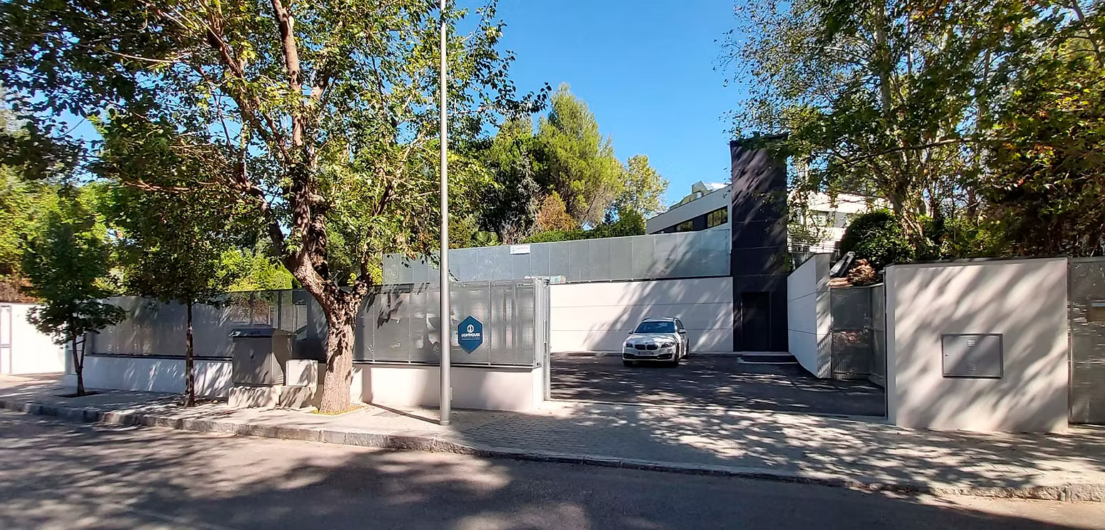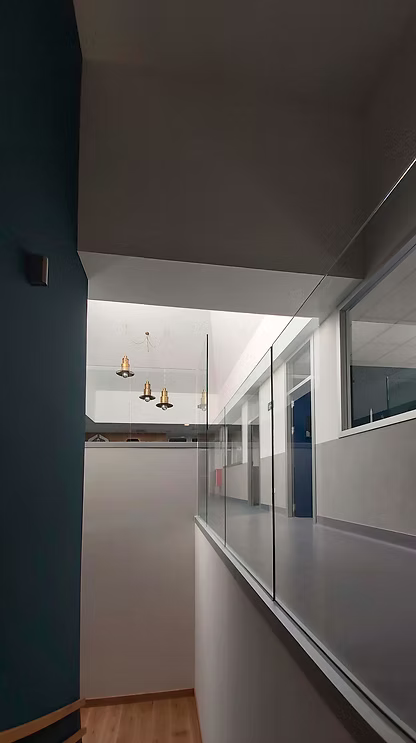 Este colegio de tres plantas organiza sus espacios en torno a un gran lucernario central que baña de luz las zonas comunes. En el interior dominan materiales neutros, madera y detalles en azul. El volumen blanco exterior, con carpinterías en negro, refuerza la claridad y orden del conjunto.