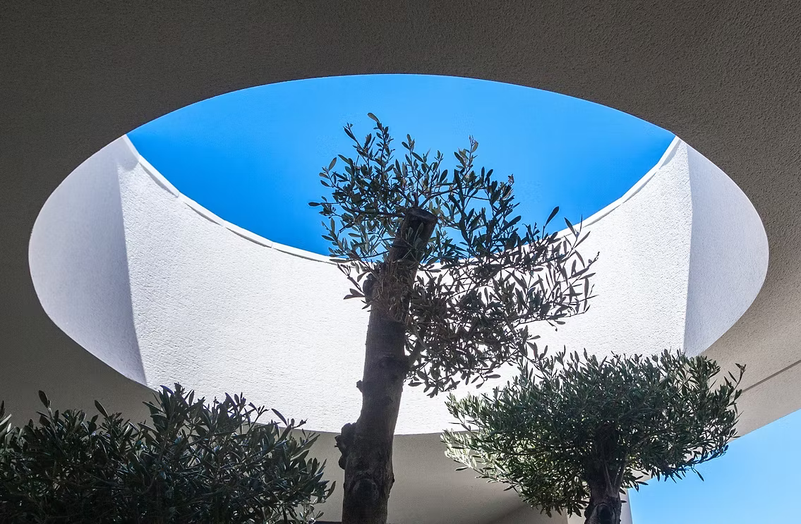 Con una fachada inspirada en la Villa Saboya de Le Corbusier, esta vivienda destaca por su horizontalidad, pórticos marcados y grandes ventanales. En el interior, lucernarios estratégicos bañan los espacios de luz natural y enmarcan las vistas al paisaje, generando una atmósfera cálida y abierta.